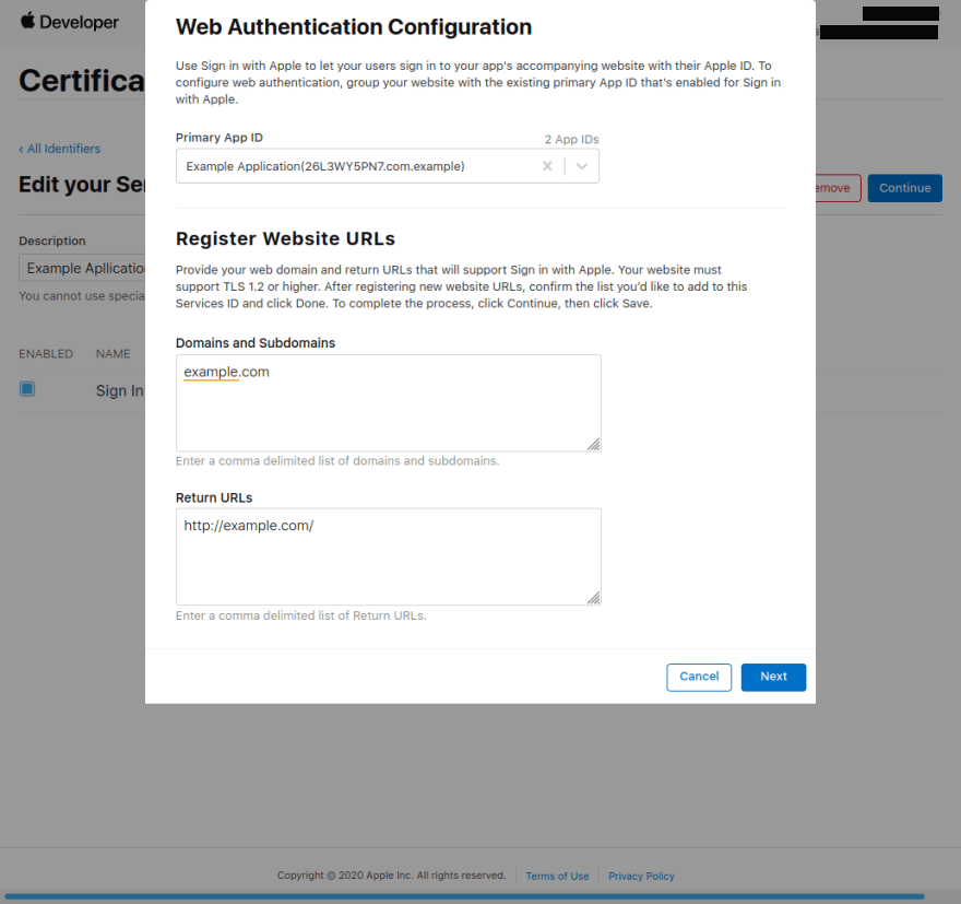 • The Return URL is the location to which apple will redirect us after authentication is completed. This is also the location where apple will send the user data after authentication. Apple will send a POST request to this URL, but OpenSSO using PopUp mode, so you just write it with yourdomain.com is enough. I've assigned http://example.com assumed that OpenSSO web is live on http://example.com.